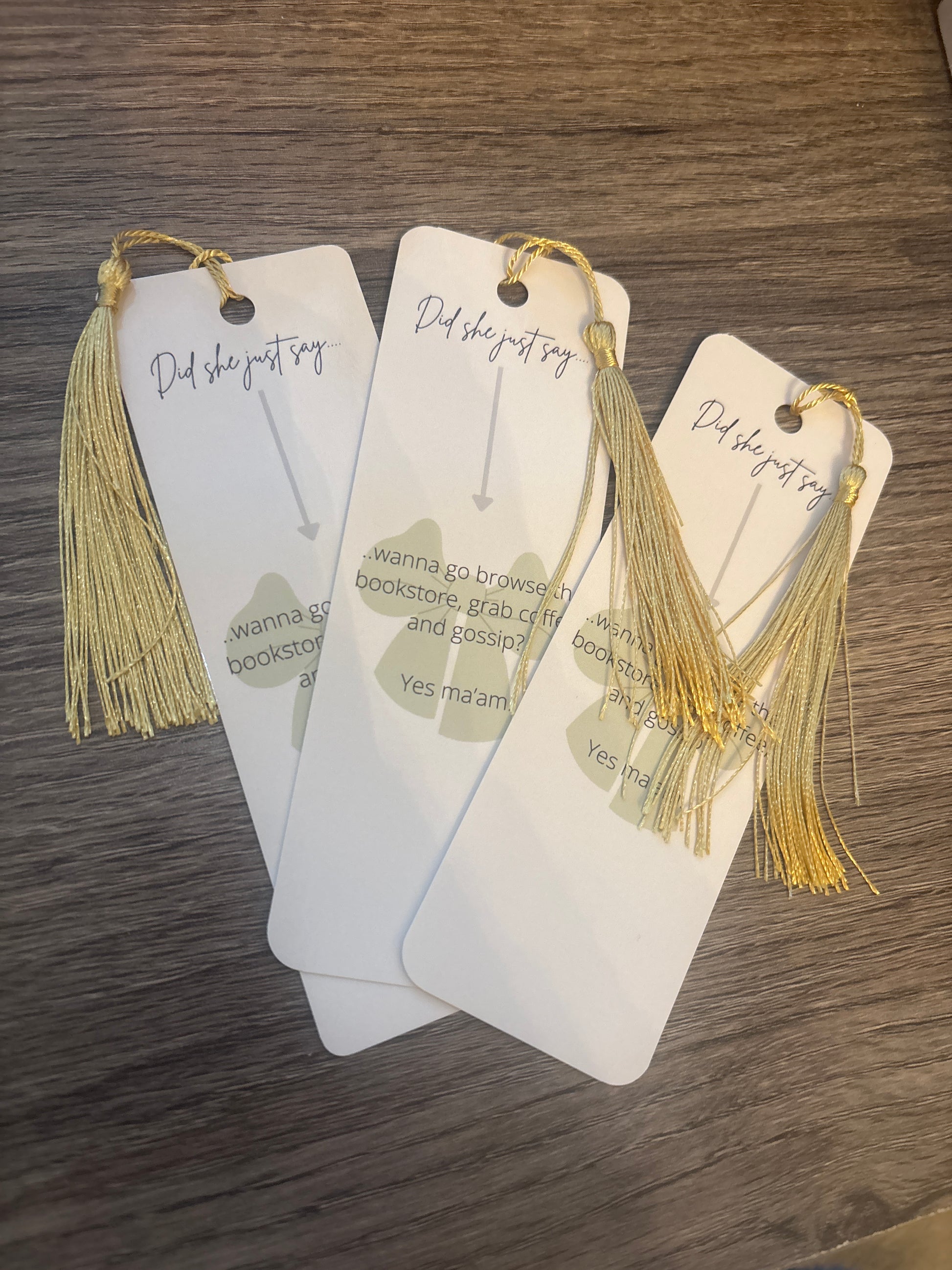 This bookmark captures the perfect blend of friendship and literary love with the playful phrase, "Did she just say .. wanna go browse the bookstore, grab coffee, and gossip? Yes ma'am." Ideal for avid readers who cherish cozy moments shared over books and conversation, it adds personality to any reading experience while keeping your place with style and humor. Durable and thoughtfully designed, it makes a wonderful gift for book lovers who appreciate both wit and warmth.