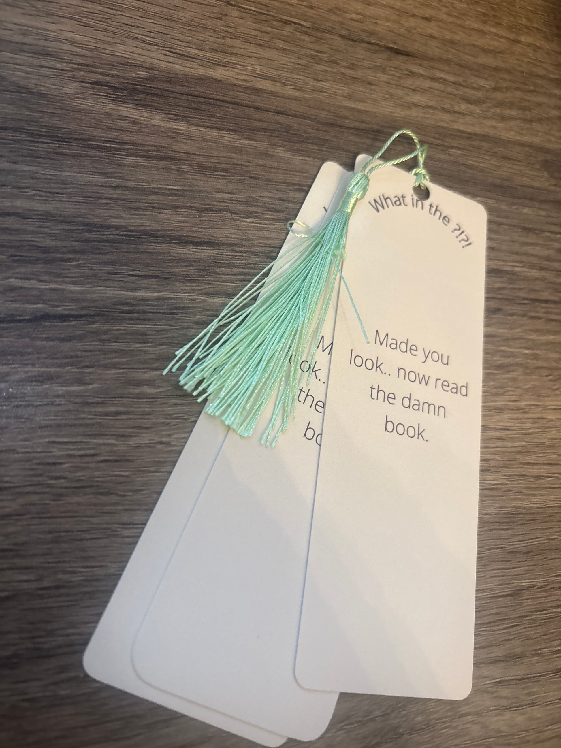 This bookmark features a bold, humorous message: "What in the ?!?! Made you look... now go read a damn book." Crafted to inspire readers with a touch of wit, it serves as a practical and entertaining companion for any book lover. Perfect for marking your place while adding personality to your reading experience. Durable and lightweight, it fits easily in any book without damaging pages. Elevate your reading routine with this clever and unique accessory.